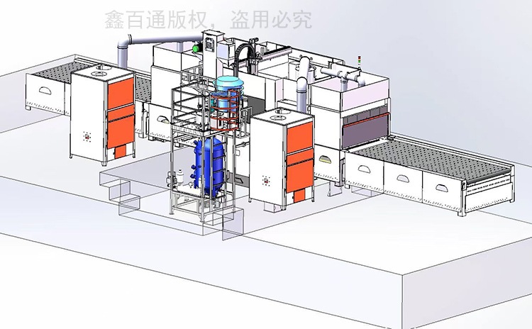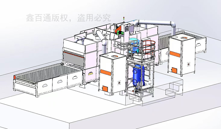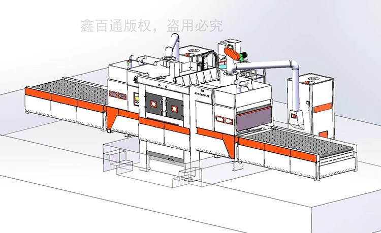 BC-15026TPSYX-4D喷砂技术参数:1.喷砂主机壳体板厚3mm,工艺折边20mm,主机外形尺寸6550*2650*4500mm,设备占地尺寸14900*5050*4500mm2.本设备配置9芯除尘箱(1500*1250*2260mm)2台,配备风机5.5kw,配备旋风分离系统(Ф500*1300*250)2套3.配备连续循环加压喷砂系统,4支Ф8mm喷嘴高压喷枪,顶部由2把喷枪,底部两把喷枪对工件进行自动升降/平移+摇摆全方位喷砂,底部两把喷枪对工件进行平移喷砂4.回砂采用提升机回收,主机中的砂料经过绞龙由提升机输送到振动筛最终汇入储砂罐中5.工件输送工作仓采用动力滚轴,输送架采用履带方式运行6.用户电源约32kw/380v;空压机75kw/380v干燥气源:16m³/min(Ф8mm喷枪,喷砂压力0.65mpa)。喷砂介质: 钢丸、钢砂、棕刚玉、玻璃珠、树脂砂、陶瓷砂等