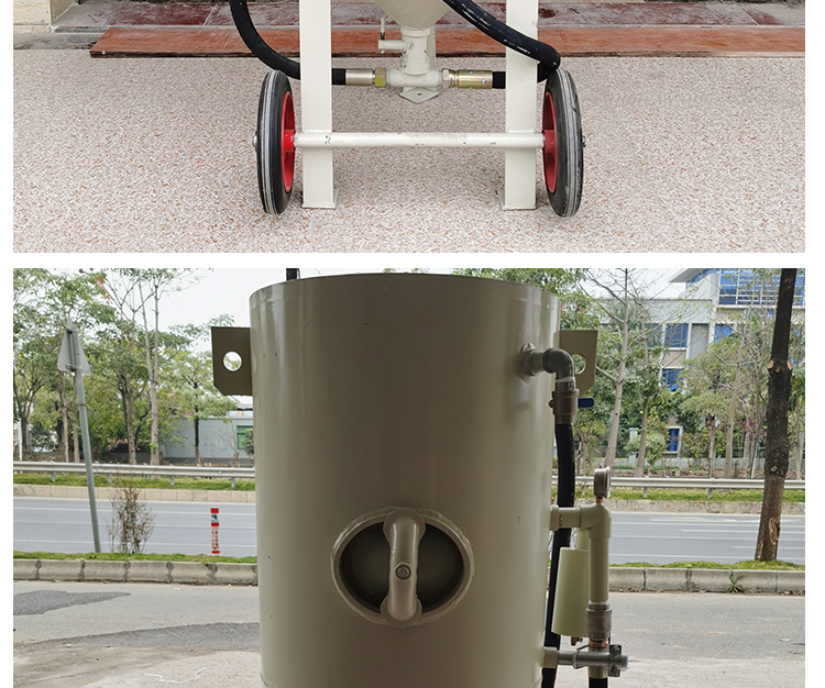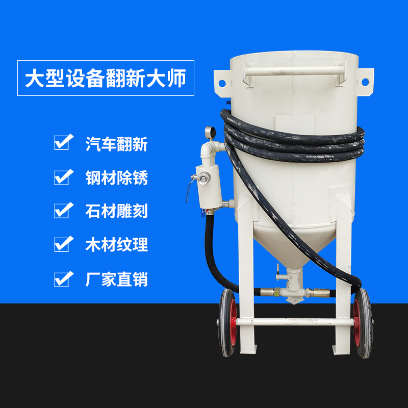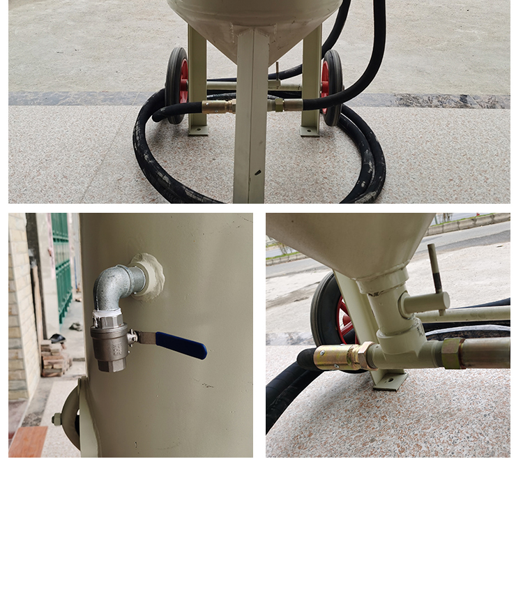 XBT-D系列压送式喷砂机由砂罐、砂阀、喷砂管、喷砂枪等部分组成。是以压缩空气为动力,将磨料(砂、铁砂、铜矿砂等)喷射到需要处理的工作表面的设备。压缩空气将磨料从沙罐中压出,经过砂阀和喷砂管到喷枪,磨料以大于200米/秒的速度喷出,由于末了对物体表面的冲击和切削 完成金属表面除锈、去氧化皮、旧漆皮和污垢的作用,并获得一定的清洁度和粗糙度 ,可达sa2.0-sa3.0的标准。对压缩空气压力磨料目数的调整变化,也可以用于建筑物,道路除垢、混凝土除垢、玻璃毛化等方面。