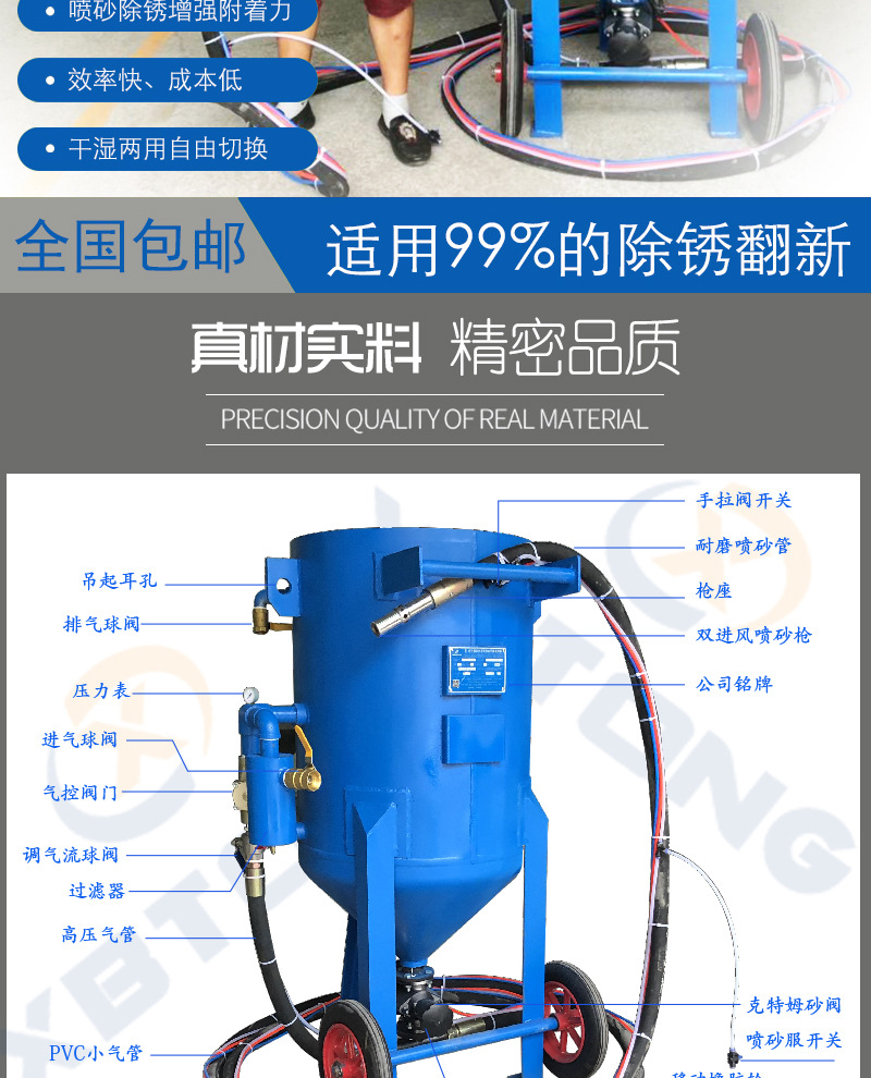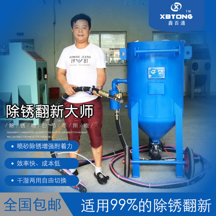 (如气控喷砂机只需喷砂工一人操作即可,喷砂作业时打开手边的控制开关开始喷砂,停止操作时也只需按一下手边的控制开关即可停止出砂)