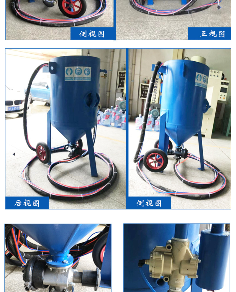 6、喷砂罐体体内在高压状态时,不能随意移动否则容易发生危险。