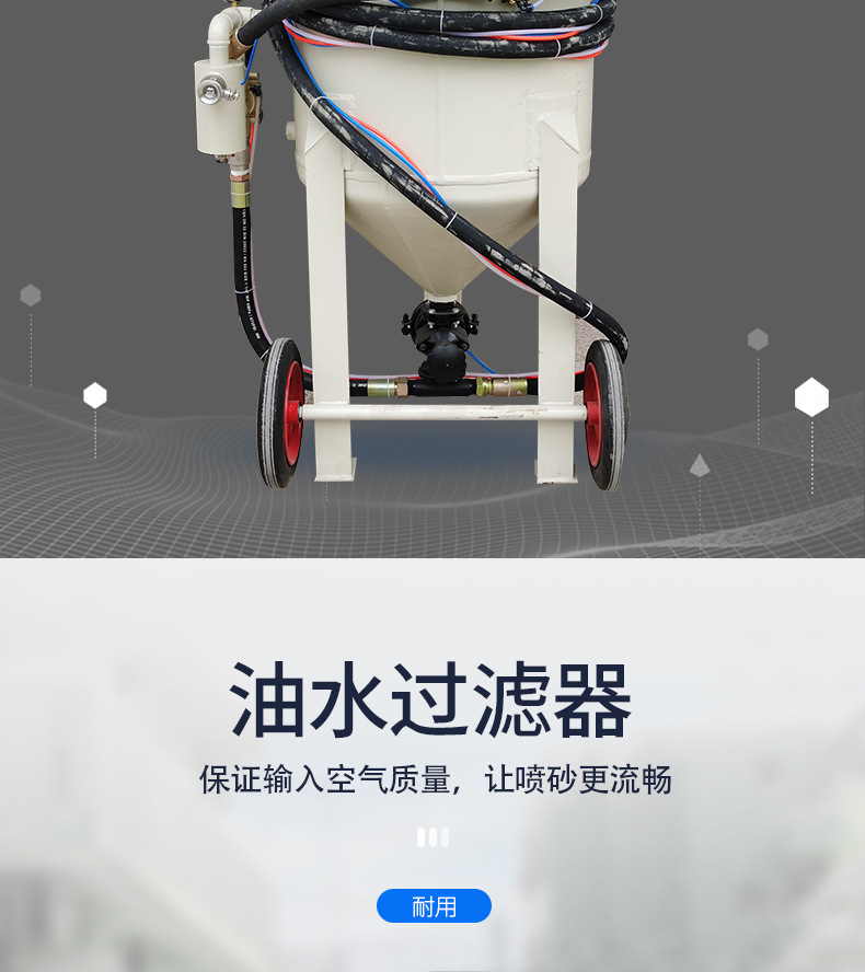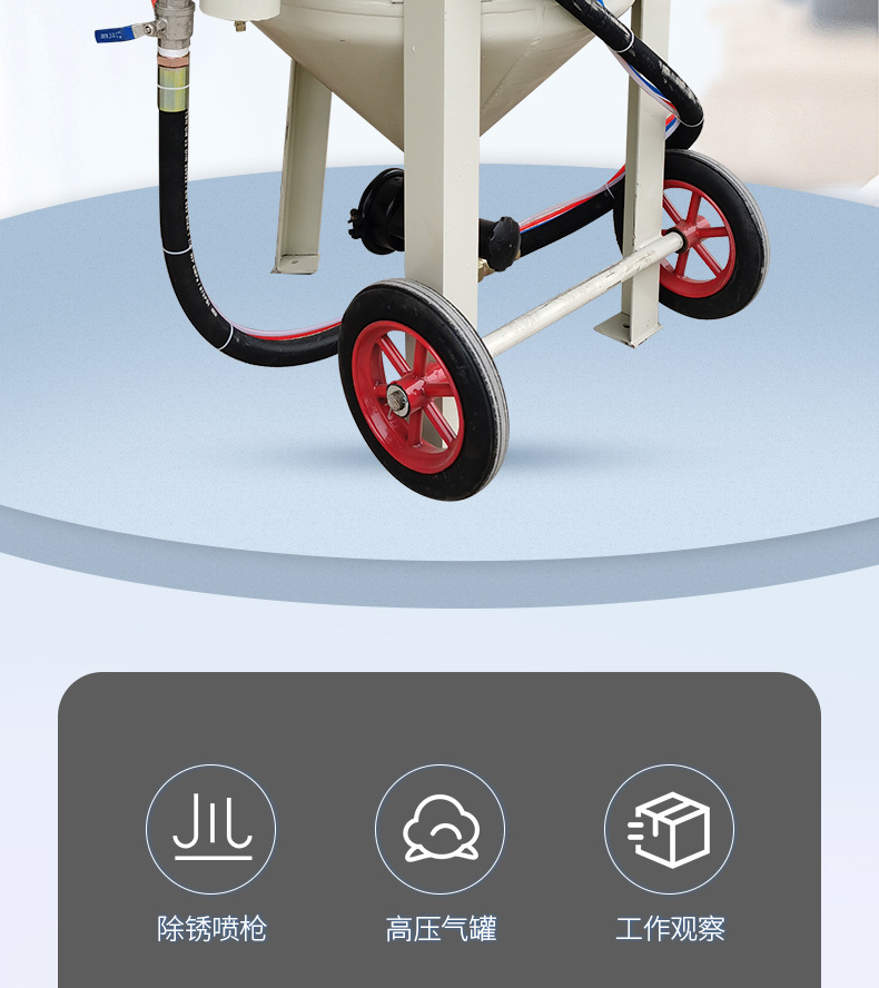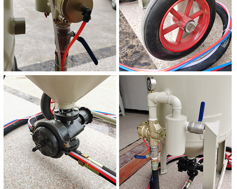 6、喷砂罐体体内在高压状态时,不能随意移动否则容易发生危险。