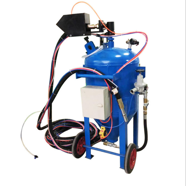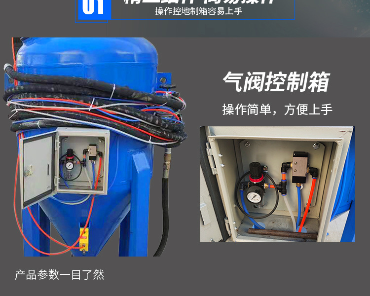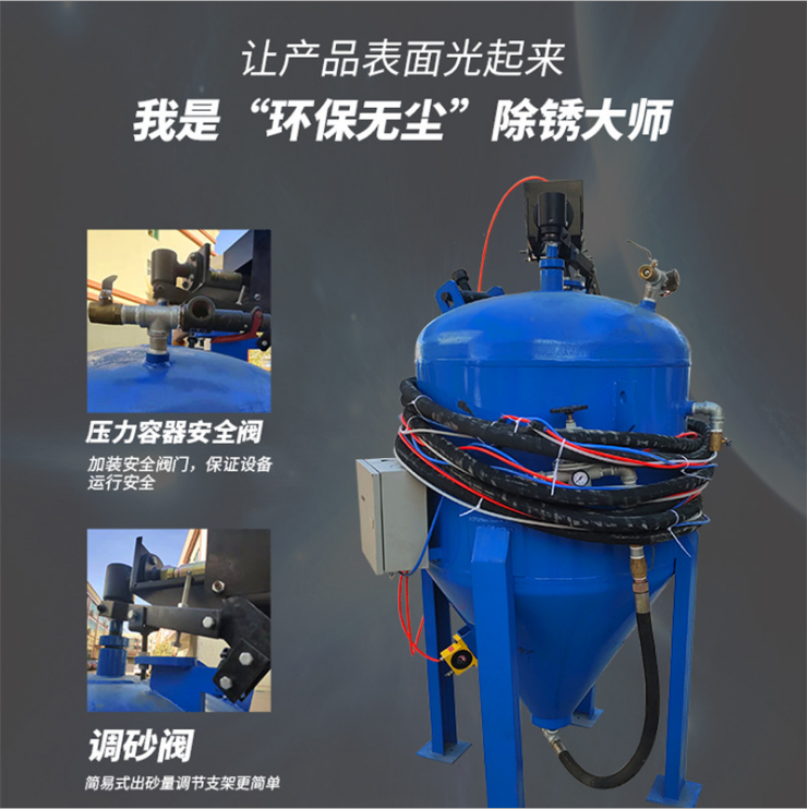 (如气控喷砂机只需喷砂工一人操作即可,喷砂作业时打开手边的控制开关开始喷砂,停止操作时也只需按一下手边的控制开关即可停止出砂)