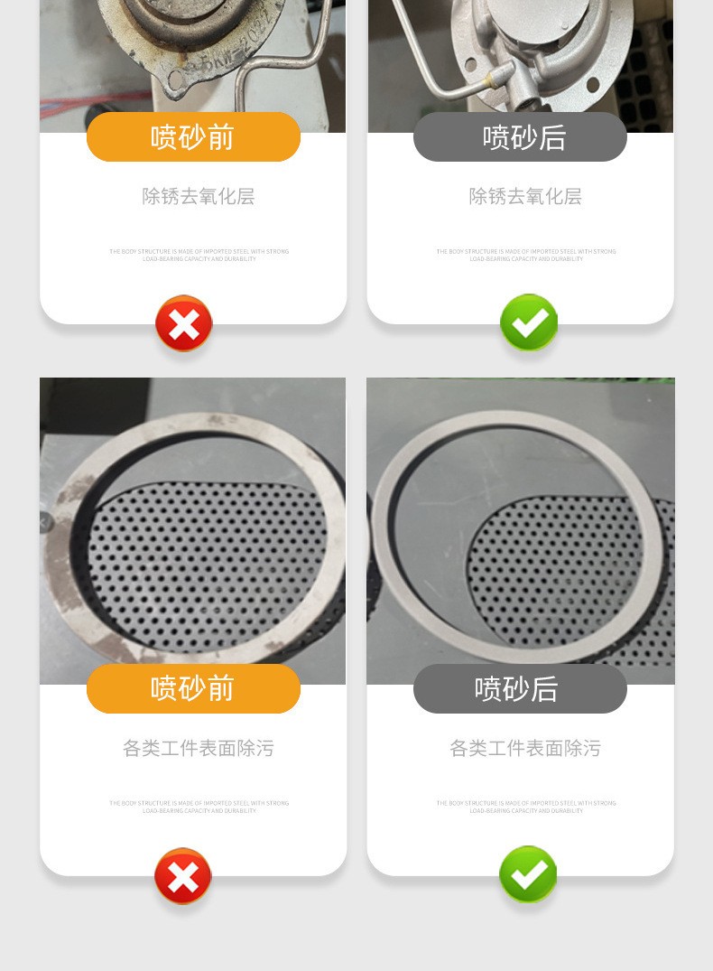 在工业生产对零部件表面处理精度与效率要求渐高的当下,厂家直供的大型双面输送式自动喷砂机是卓越之选。其独特双面输送设计突破传统单面处理局限,能使工件平稳快速地双面同步喷砂,大幅提升效率;先进喷砂控制系统可精准调节压力、流量、喷枪速度等参数,确保喷砂效果一致且能满足多样需求;设备主体用高强度钢材制造,关键部件选知名品牌,坚固耐用且稳定性强,还有完善防护与安全系统;提供个性化定制服务,依据客户工件特点及喷砂要求打造适配方案;售后团队提供安装调试、操作培训、定期维护、故障维修等全方位服务,若您正寻求高效精准耐用的大型喷砂机,欢迎立即联系我们。