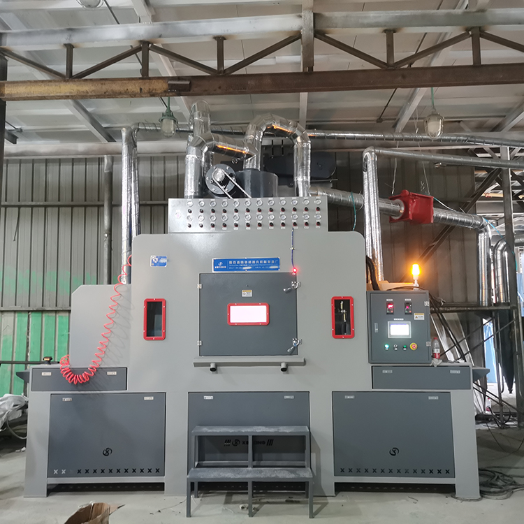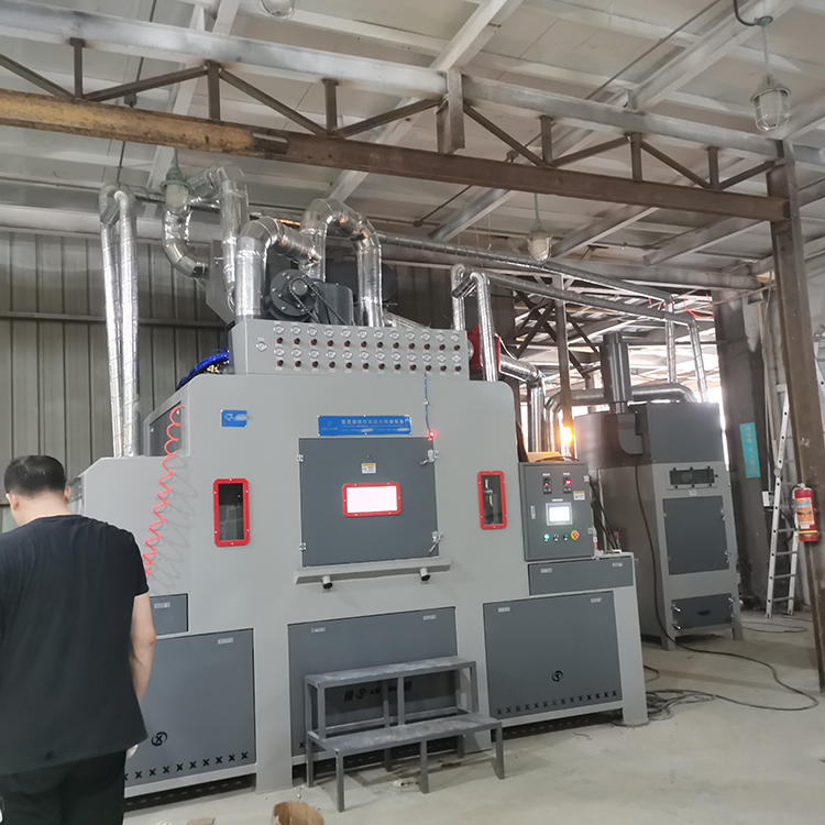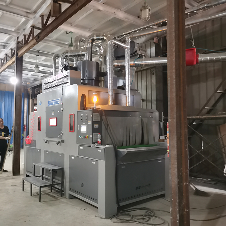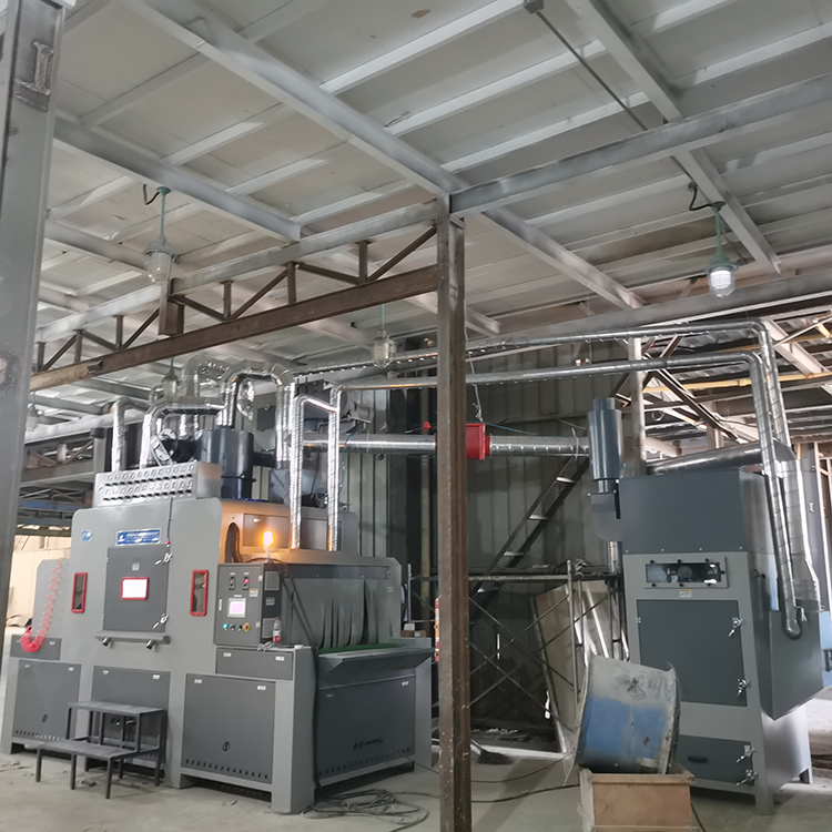 浙江xx镀钛科技有限公司,现场安排调试输送式自动喷砂机,XBT1300- 24A 提升型,主机结构采用 2.0MM- 10MM 钢板焊接而成,