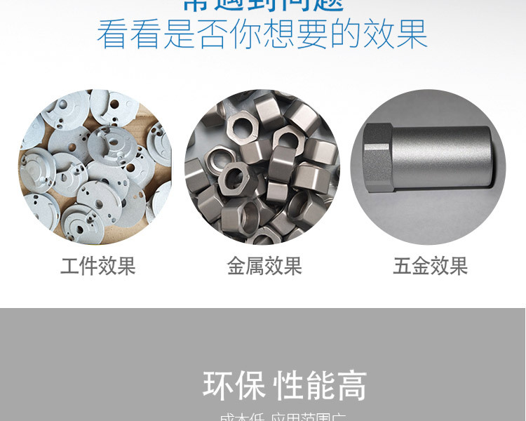 电镀、喷涂前处理,提高附着力;各类模具、铸造件、冲压件、金属表面的去氧化皮、去残渣、除锈、除油、旧件翻新;陶瓷制品、玻璃制品、塑胶制品光饰、雾化作用、去毛边、去毛刺,增强喷涂附着力。