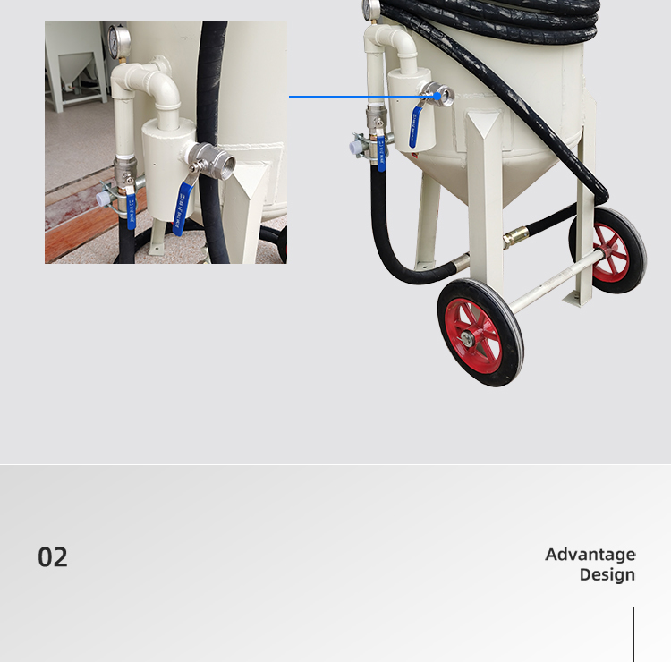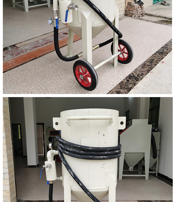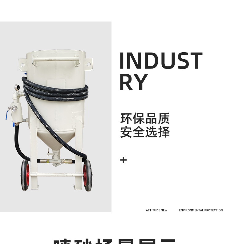 XBT-D系列压送式喷砂机由砂罐、砂阀、喷砂管、喷砂枪等部分组成。是以压缩空气为动力,将磨料(砂、铁砂、铜矿砂等)喷射到需要处理的工作表面的设备。压缩空气将磨料从沙罐中压出,经过砂阀和喷砂管到喷枪,磨料以大于200米/秒的速度喷出,由于末了对物体表面的冲击和切削 完成金属表面除锈、去氧化皮、旧漆皮和污垢的作用,并获得一定的清洁度和粗糙度 ,可达sa2.0-sa3.0的标准。对压缩空气压力磨料目数的调整变化,也可以用于建筑物,道路除垢、混凝土除垢、玻璃毛化等方面。