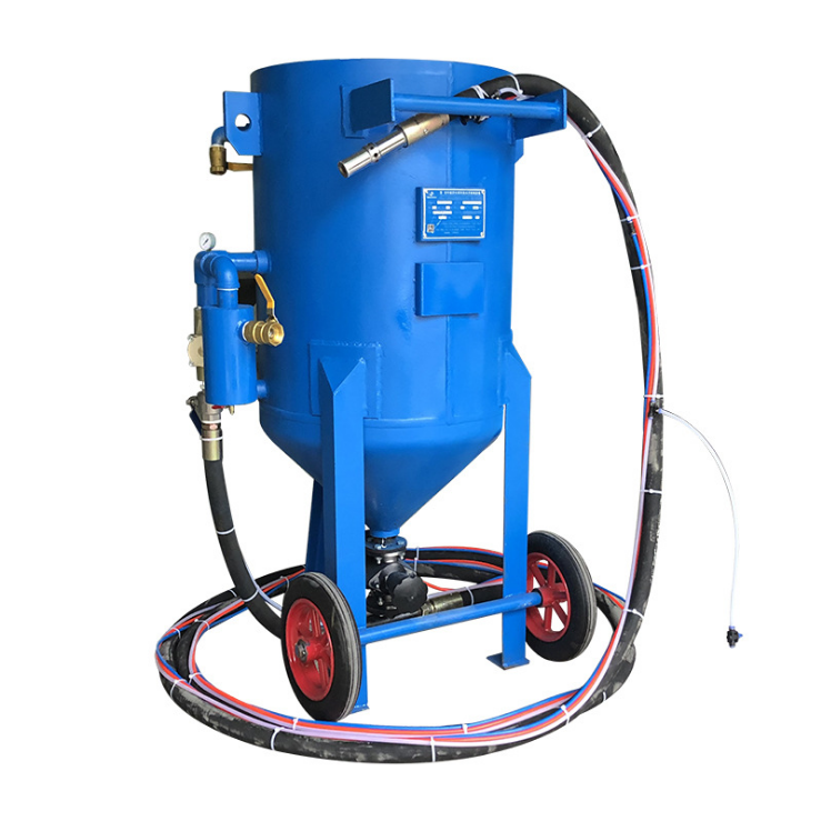 卸掉喷砂软管及相应的密封垫,关闭主气阀,打开磨料阀,受潮的磨料即可被清除,(注意:磨料的出口速度很高,人员必须远离磨料阀的出口)随后关闭进气阀,打开排气阀,在把卸掉喷嘴的喷砂软管接到喷砂机上。喷砂软管内的湿磨料也即被清除干净,关闭进气阀 打开排气阀,再把喷嘴接到喷砂软管上,喷砂作业即可按正常步骤重新进行。