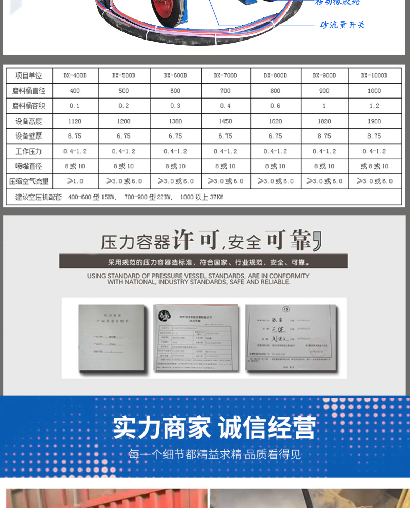 6、喷砂罐体体内在高压状态时,不能随意移动否则容易发生危险。