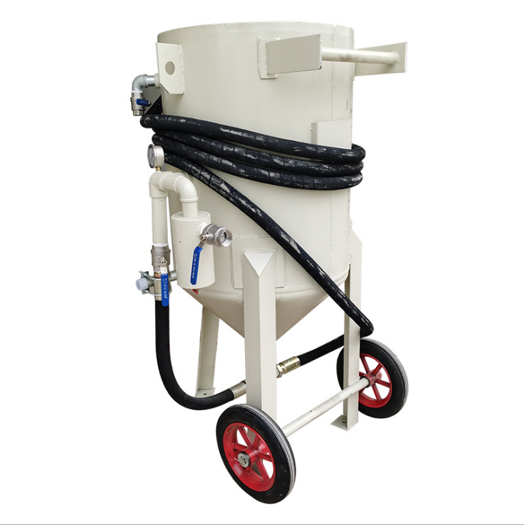 卸掉喷砂软管及相应的密封垫,关闭主气阀,打开磨料阀,受潮的磨料即可被清除,(注意:磨料的出口速度很高,人员必须远离磨料阀的出口)随后关闭进气阀,打开排气阀,在把卸掉喷嘴的喷砂软管接到喷砂机上。喷砂软管内的湿磨料也即被清除干净,关闭进气阀 打开排气阀,再把喷嘴接到喷砂软管上,喷砂作业即可按正常步骤重新进行。